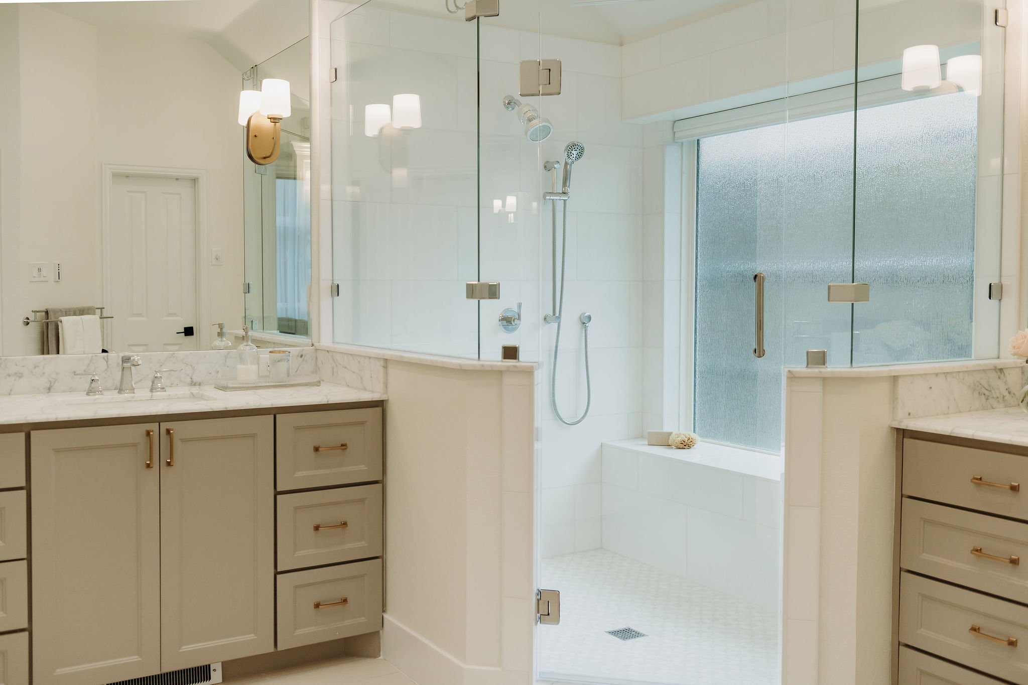 This bathroom had a good footprint, but it needed new finishes to brighten the space, as well as better storage. We lightened the cabinets and brought in shimmery metallic accents that would better reflect the natural light. The drawer space was maximized for organization; a space for everything behind closed doors to keep the look clean and bright.